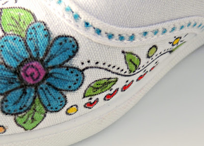 As you can see, I just kept adding stuff and filling in white spaces. I did try to add similar elements to keep them cohesive (like the blue flower with a magenta center on both shoes, etc.).